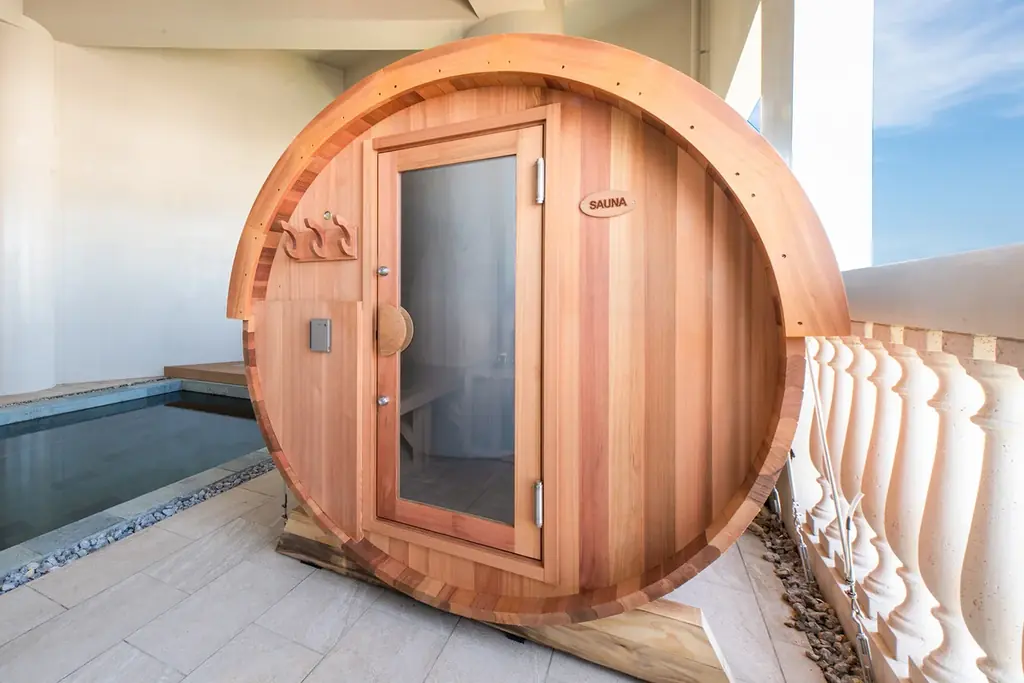 バレルサウナは内装にウェスタンレッドシダーを使用し、柔らかな木の香りと温もりを重視しています。香り高い材を用いることで深い呼吸を促し、リラックス効果を高める設計です。また、サウナ後には目の前のプライベートプールでの浮遊浴が可能であり、水風呂代わりにプールを利用できます。