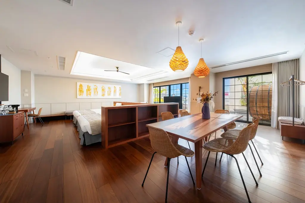 ゴールドスイートはプレミア棟6階に位置し、1室あたり最大5名まで宿泊可能な広さを確保しています。各室にはテラス、バレルサウナ、プライベートプール、浴室に引き込まれた天然温泉、ミニキッチンが備わっており、中長期滞在やワーケーション、家族や友人との特別な休暇にも対応します。