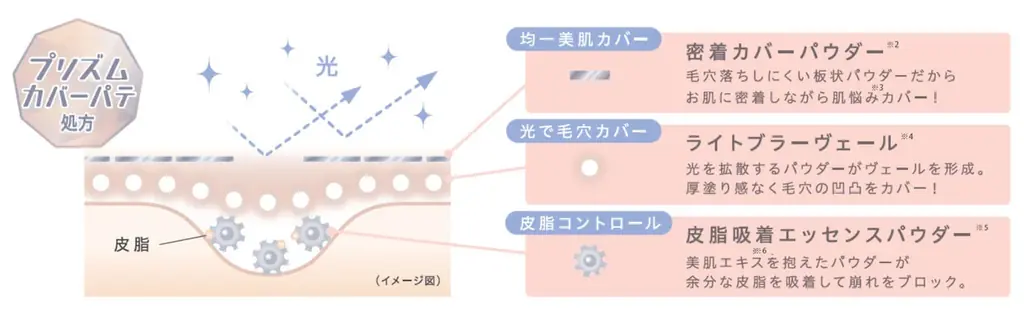 プリズムカバーパテ処方を採用し、光の効果で厚塗り感なく薄膜カバーすることで毛穴を目立たせない仕上がりを実現するとしています。さらにブルーライトカット成分※9の配合や無香料・無鉱物油・パラベンフリーという仕様も明記されています。