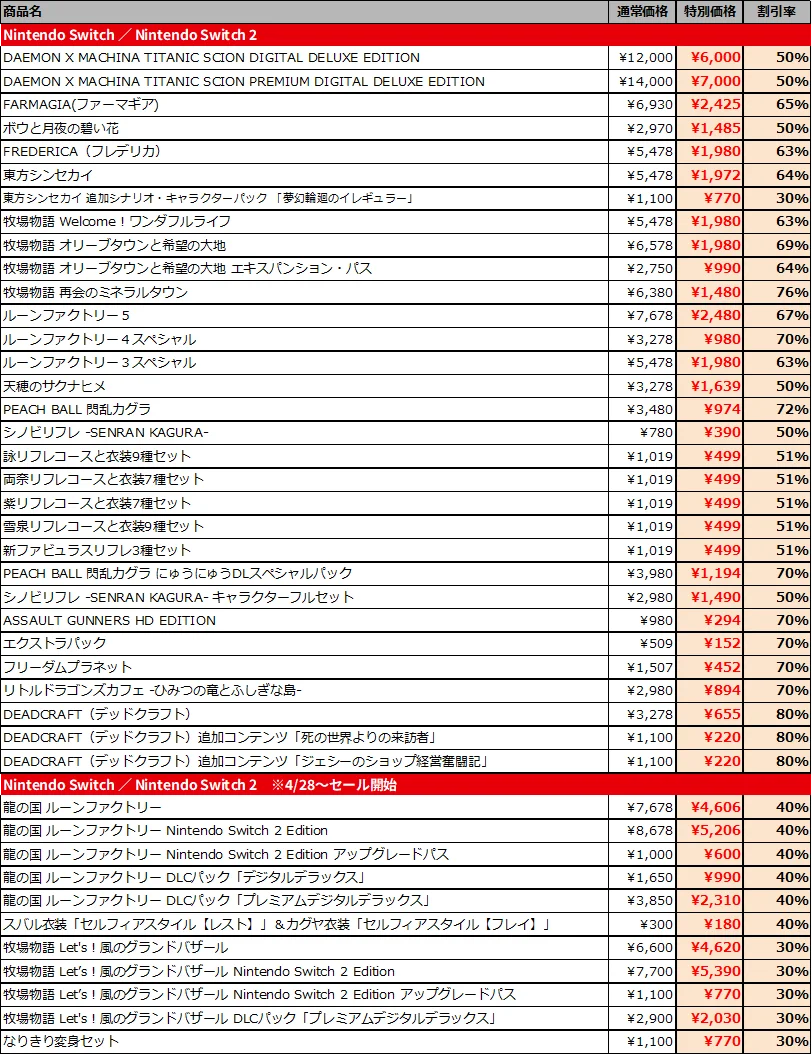 本セールはストアごとに開始時期や終了日が異なる場合があります。ニンテンドーeショップでは一部商品のセール開始が4月28日となる旨が案内されていますが、その他のタイトルについても同様に開始・終了日時が商品ごとに設定されていることが想定されます。必ず購入前にストア上の価格表示を確認してください。