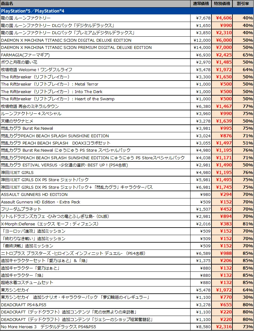 | タイトル | プラットフォーム | 通常価格(税込) | セール価格(税込) | 割引率 | 販売ページ |