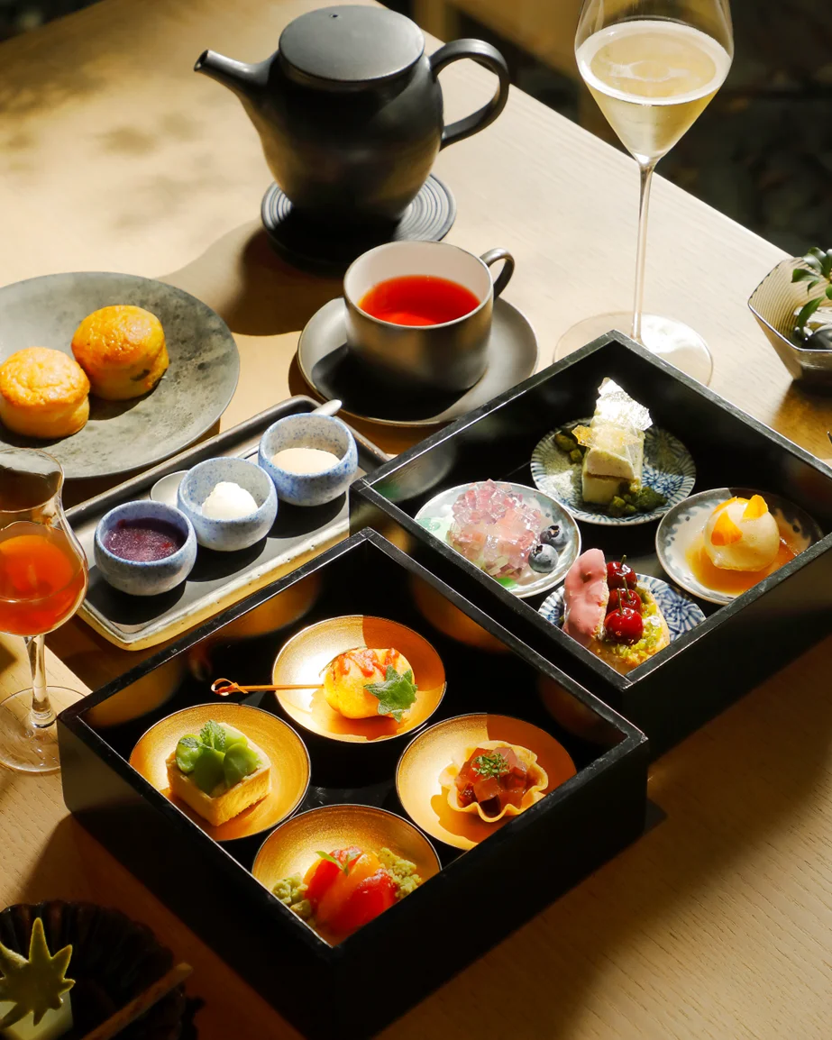 和紅茶のフルーティーソーダや、柚子を使った羊羹など、和の要素と洋菓子の技法が融合した内容となっています。重箱仕立てでセイボリーとスイーツを層に分けて提供する点も特徴です。