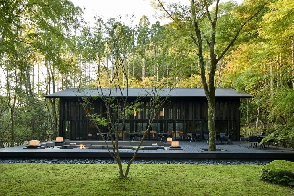 アマン京都は京都北部、左大文字山への連なりである鷹峯三山の麓に位置するリゾートです。約2万4千平方メートルの敷地に複数の棟が点在し、森の庭と調和するように建築が配置されています。