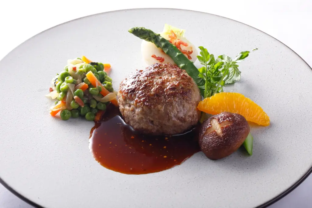 - 国産鴨肉のコクと豚肉のジューシーさを合わせたハンバーグ。素材のバランスにより深みのある味わいです。