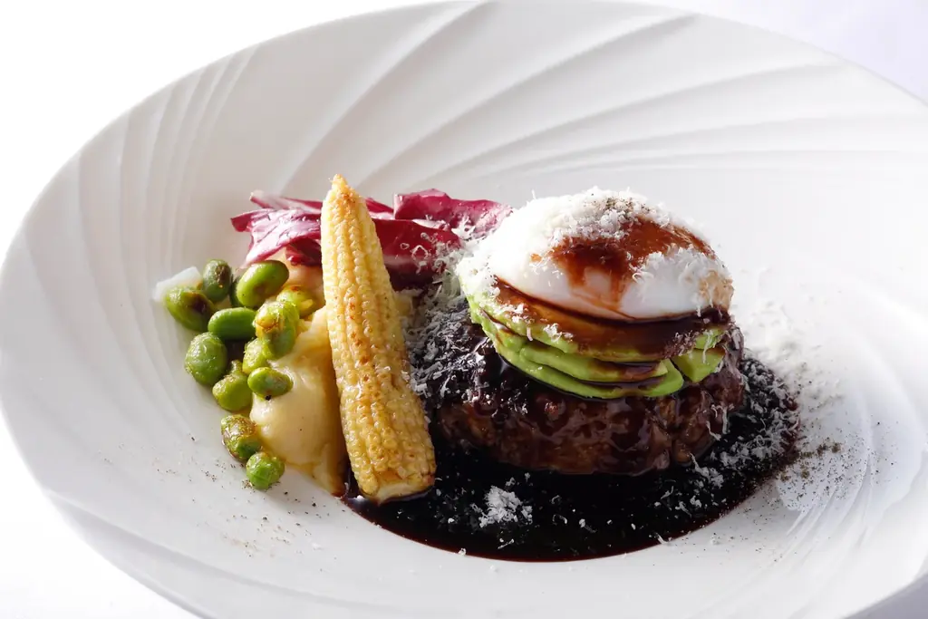 - 飛騨牛100%の粗挽きハンバーグにアボカドとペコリーノチーズを合わせた、コクと香りを重視した仕立てです。