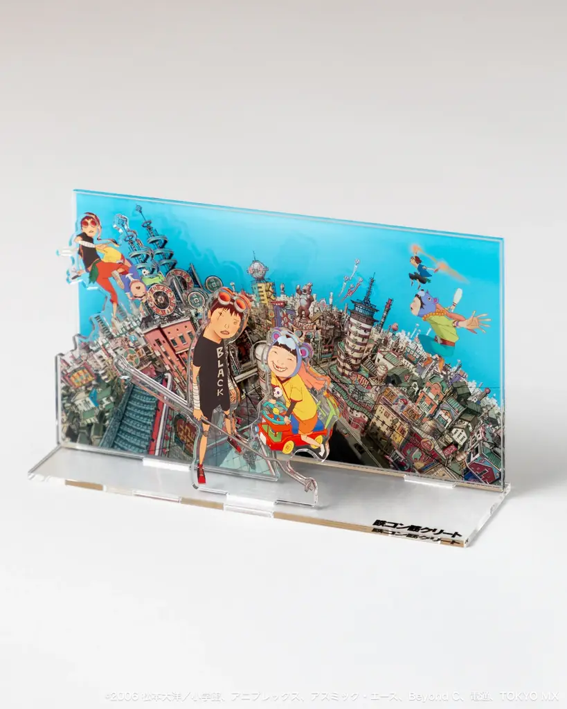 「宝町アクリルジオラマ」は物語の舞台である宝町の街並みを精緻に立体化したコレクターズアイテムです。クロとシロの疾走感や街の風景を凝縮し、飾って楽しめる仕様となっています。作品の世界観を手元で再現するためのデザインとサイズ設計が施されています。