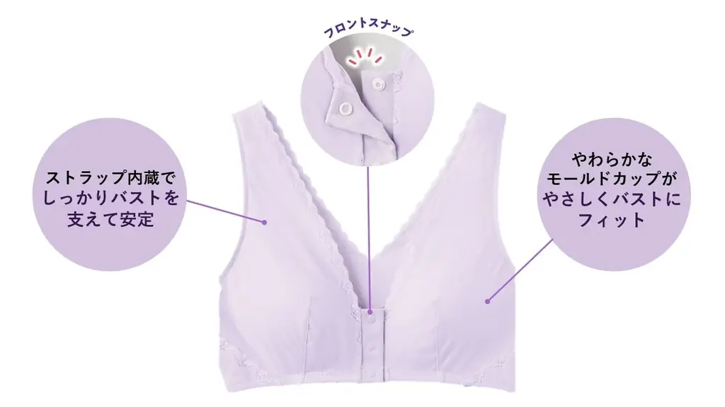 本製品は「背中に手が回りにくい」「肩が上がりづらい」「締め付けや肌当たりが気になる」といった、年齢に伴う身体の悩みに応えることを念頭に開発されました。前開きのフロントスナップ方式を採用することで、自分一人での着脱が容易になる点が最大の特長です。