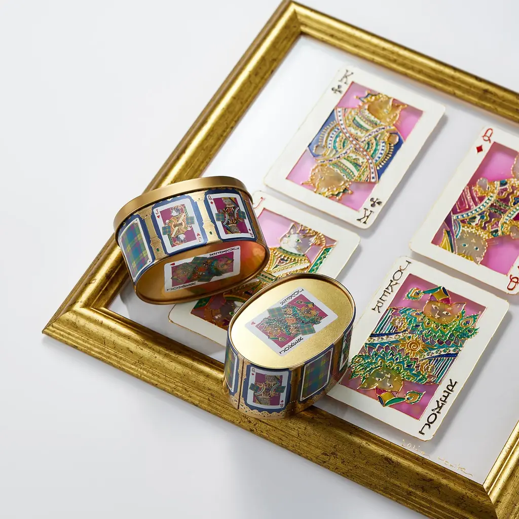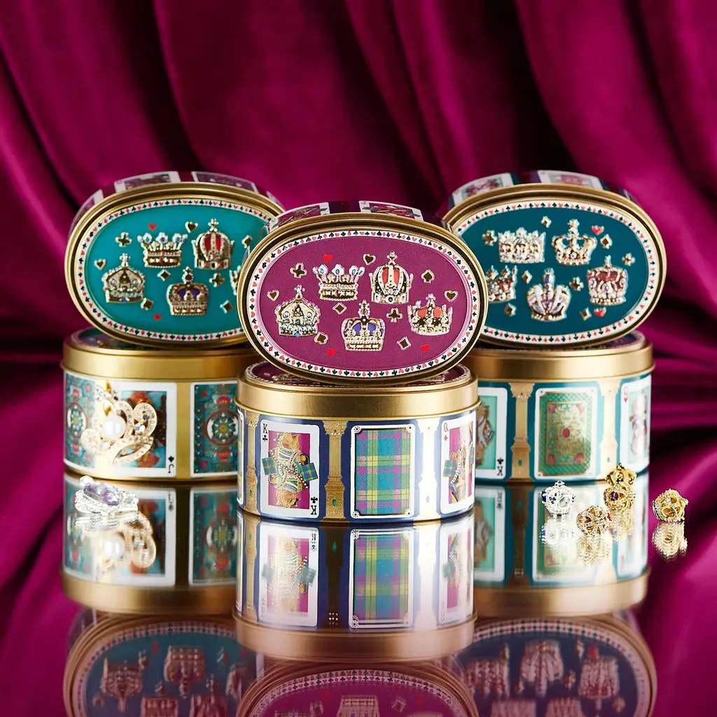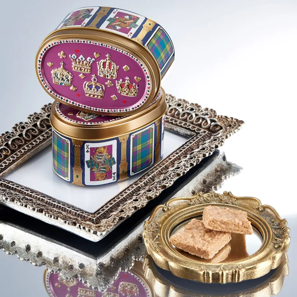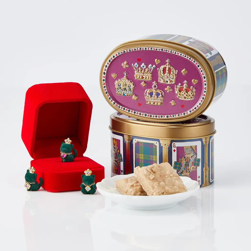 缶の側面には、伊勢丹の紙袋でお馴染みのマクミラン柄をあしらったトランプ風のデザインを配し、蓋面の王冠デザインの背景色は伊勢丹の紙袋取っ手の色をイメージして仕上げられています。トランプの絵柄はガラス絵風のネコのお姫様たちで、各ネコは伊勢丹の紙袋を持ってショッピングを楽しむ姿が描かれています。