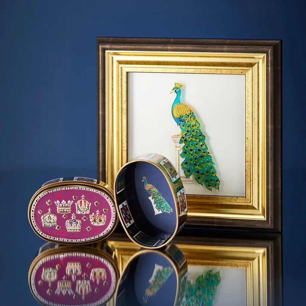 - マクミラン柄トランプ、王冠(紙袋取っ手の色)、ネコのお姫様のガラス絵、孔雀モチーフのジョーカー、缶内底の孔雀ガラス絵