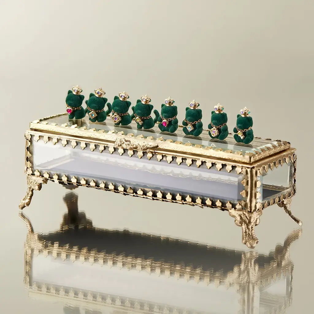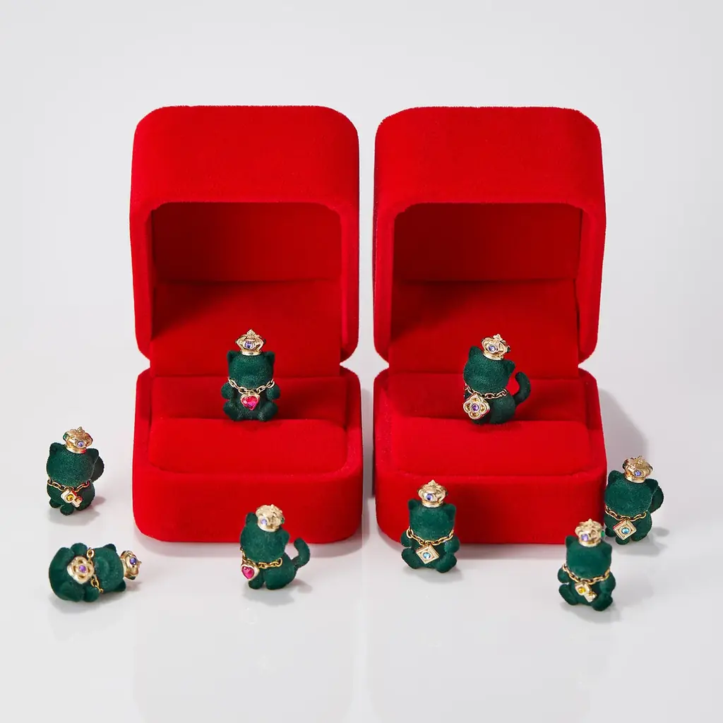 店頭では、全8種類から選べる「ネコの宝石」を用意します。これらは本企画のために新たに制作されたミニチュアの飾りで、フロッキー素材を用いた高さ約2cmの小さなネコフィギュアに王冠やネックレスなどのアクセサリーをあしらい、宝石のような輝きを表現しています。