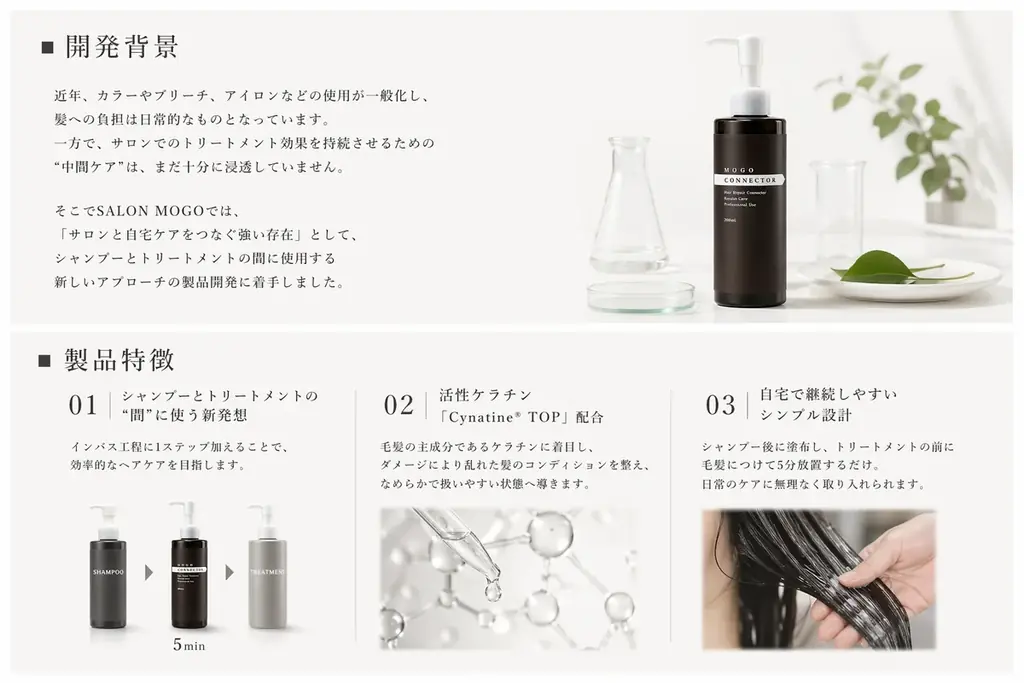 開発背景として、カラーやブリーチ、アイロンの使用が一般化した現代では日常的なダメージが増えている一方、サロン施術後の質感を長持ちさせるための集中ホームケアは十分に浸透していないという課題がありました。SALON MOGOはこの課題に対して「サロンと自宅ケアをつなぐ強い存在」として、シャンプーとトリートメントの間に使う製品の開発に着手しました。