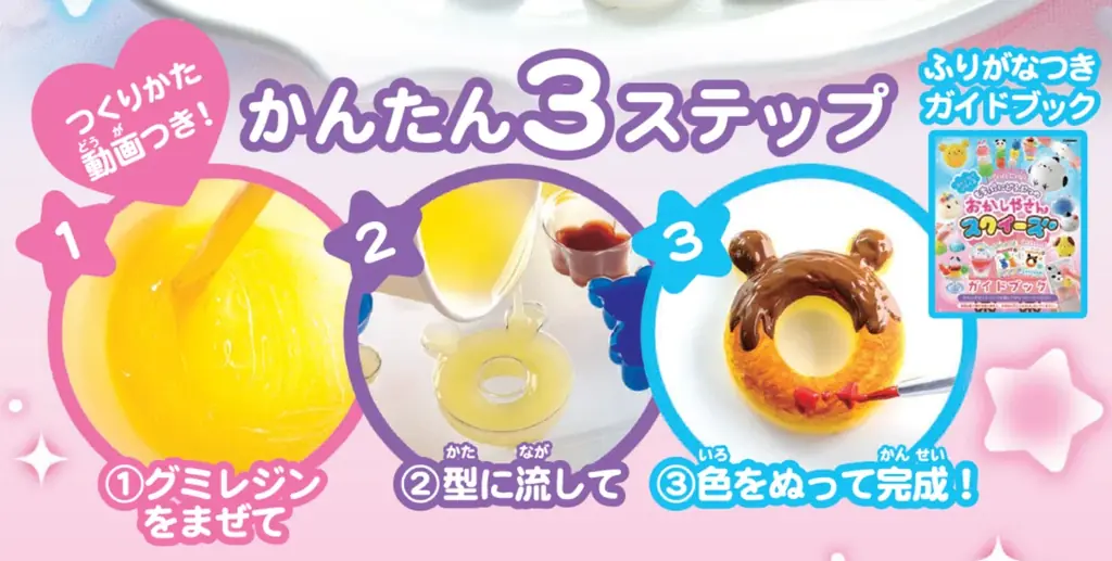 基本的な制作工程はシンプルに設計されています。主要手順は材料を混ぜて型に流し込み、固めてから仕上げとデコレーションを行う流れです。混色はインクで自在に行え、ガイドブックと動画で手順を丁寧にフォローします。
