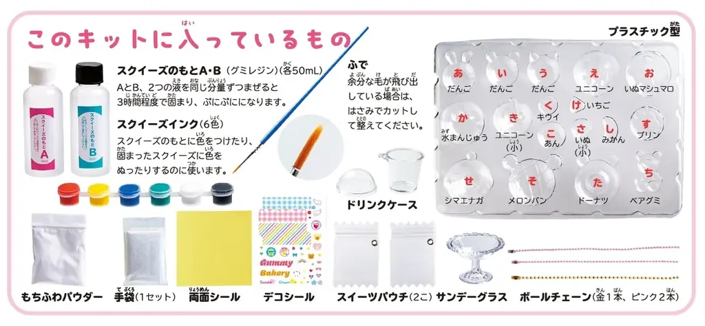 本キットは、スクイーズ作りに必要な材料とアレンジパーツが一式揃っているデラックスセットです。グミレジンと呼ばれる特別な素材を中心に、色付け用インクやオリジナルプラスチック型など、個別に揃える必要がないよう構成されています。
