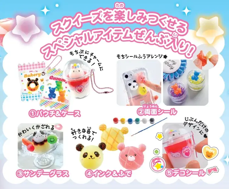 作ったスクイーズはそのまま飾れるだけでなく、もっちりシールにしたり、チャームにして持ち運べるようにするためのパウチやケースといったアレンジ用アイテムも同梱されています。以下に同梱物の主要項目を整理します。