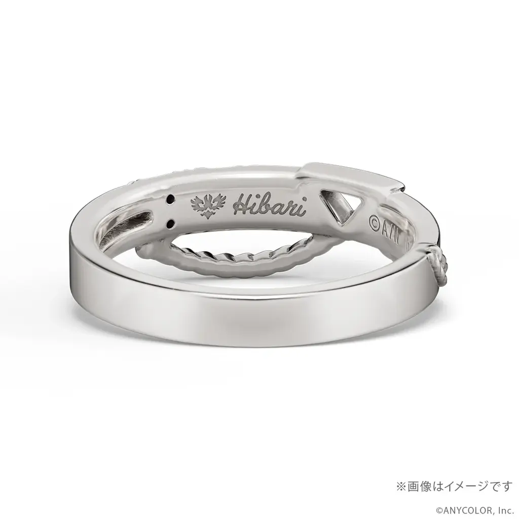 宝石はアメシスト(心の平和や安定)とロードライトガーネット(前向きなエネルギー)を組み合わせ、ムードメーカーとしての渡会さんを彷彿とさせる色合いと意味を持たせています。内側にはモチーフアイコンと「Hibari」の刻印、素材はシルバー925です。