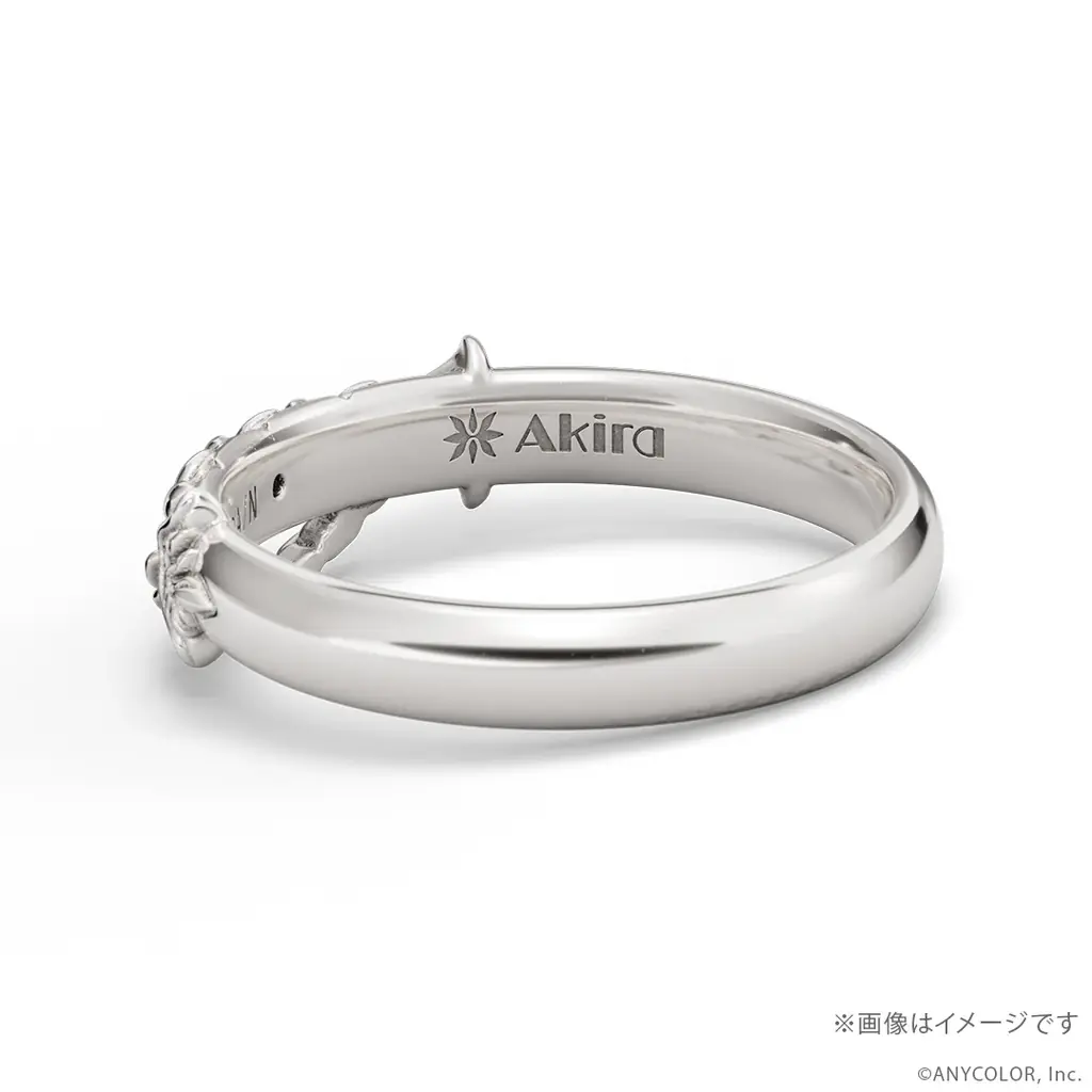 中央に留めた宝石はブルーサファイアで、石言葉として【誠実】【知性】【成功】の意味があります。揺るぎない心で物事に向き合う四季凪さんのイメージを表現しています。内側刻印はモチーフアイコンと「Akira」。素材はシルバー925です。