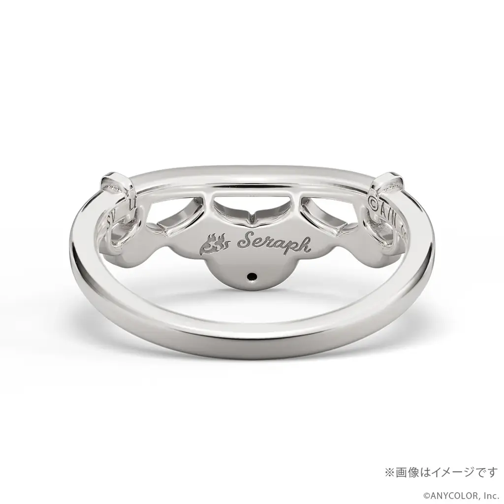 正面モチーフにはガーネット(情熱・真実)とブラックトリートメントダイヤモンド(不屈・成功)を配し、常に熱意を持って挑戦を続けるセラフさんを表現しています。内側にはモチーフアイコンと「Seraph」の刻印、素材はシルバー925です。