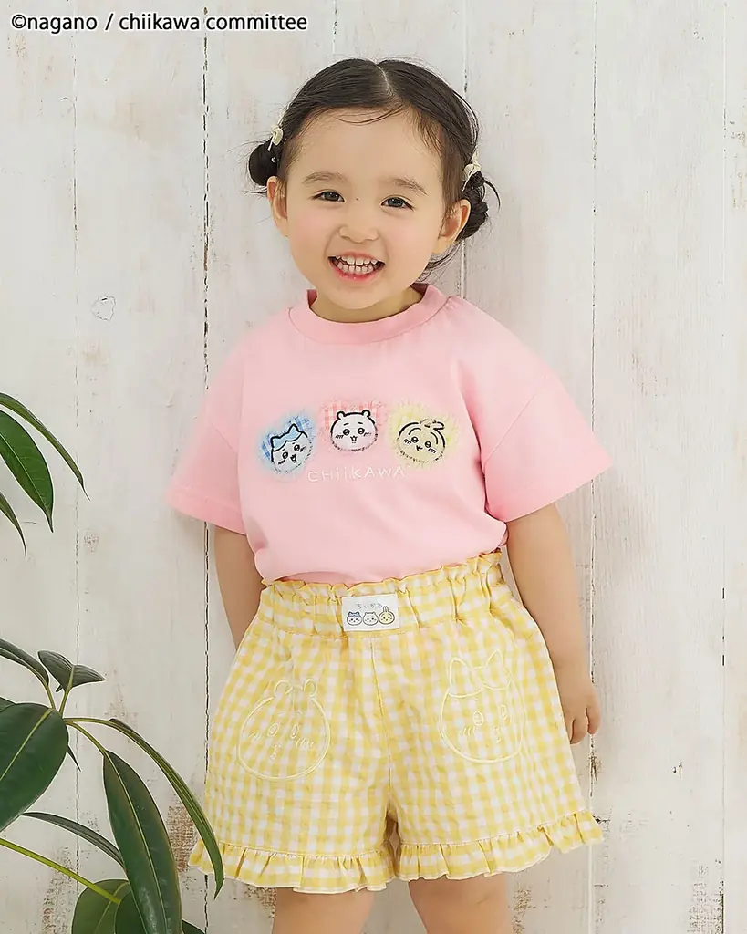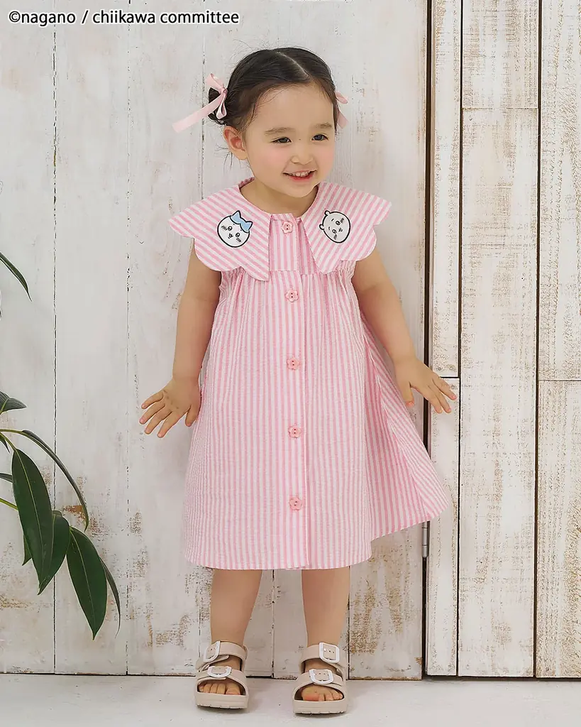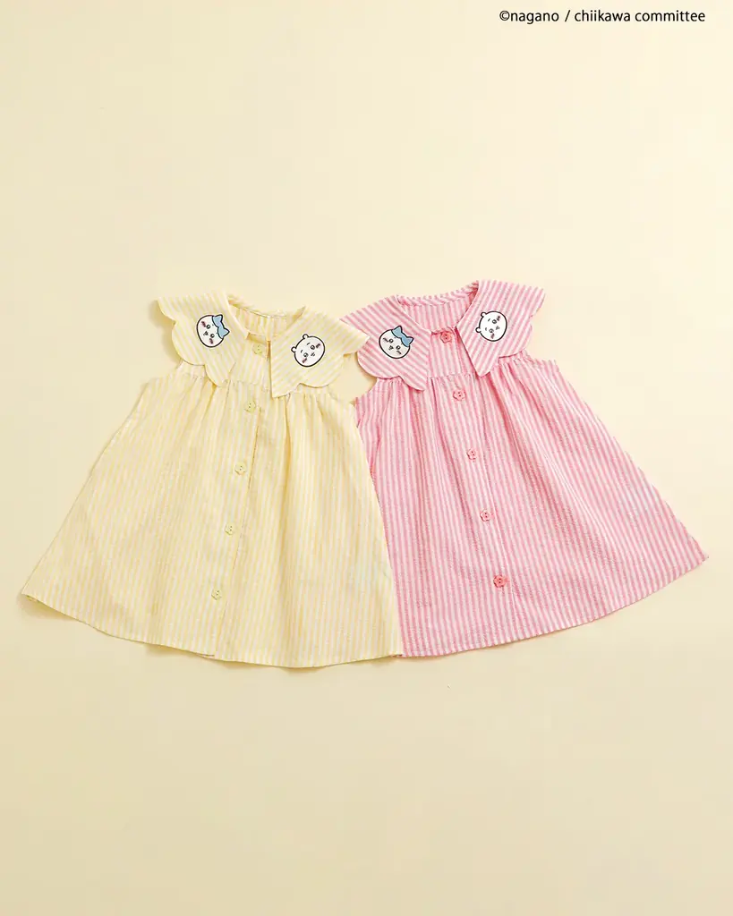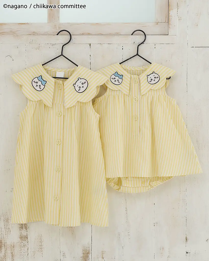 襟付きのワンピースとベビーロンパスは、襟部分にアニメちいかわのデザインが施され、スカラップの襟が後ろ姿の可愛さを引き立てます。キッズ用ワンピースはイエローとピンクの2色、ベビーロンパスはイエローでの展開です。いずれもリンクコーデが可能になっています。