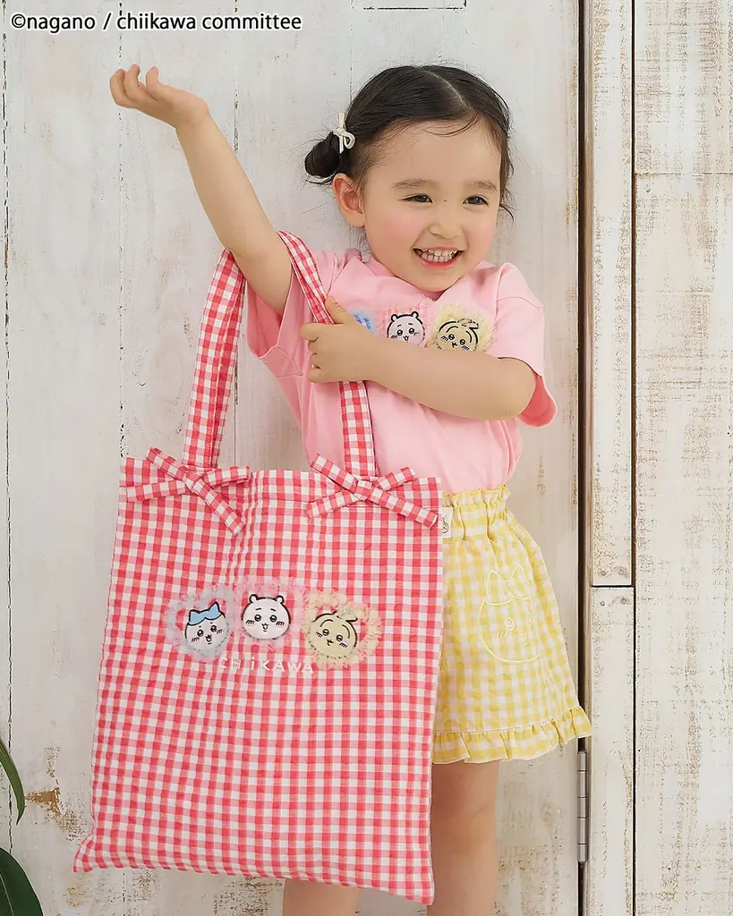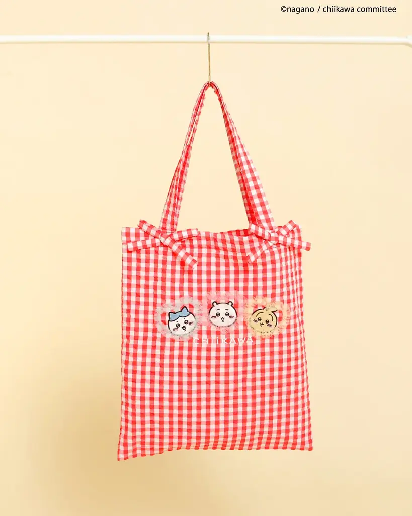 アニメちいかわフリルトートバッグは、赤チェックに大きなリボンをあしらい写真映えするデザインです。親子で共有できるフリーサイズのトートバッグとして、ちょっとしたおでかけにも使用しやすい仕様になっています。
