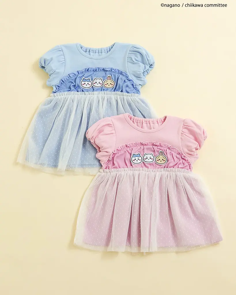 アニメちいかわチュールドッキングトップスは、女の子向けにふんわりとしたパフスリーブとドットチュールを組み合わせた一着で、夏のコーディネートの主役に使えるデザインです。サックスとピンクの2色展開で、上品な遊び心を加えています。