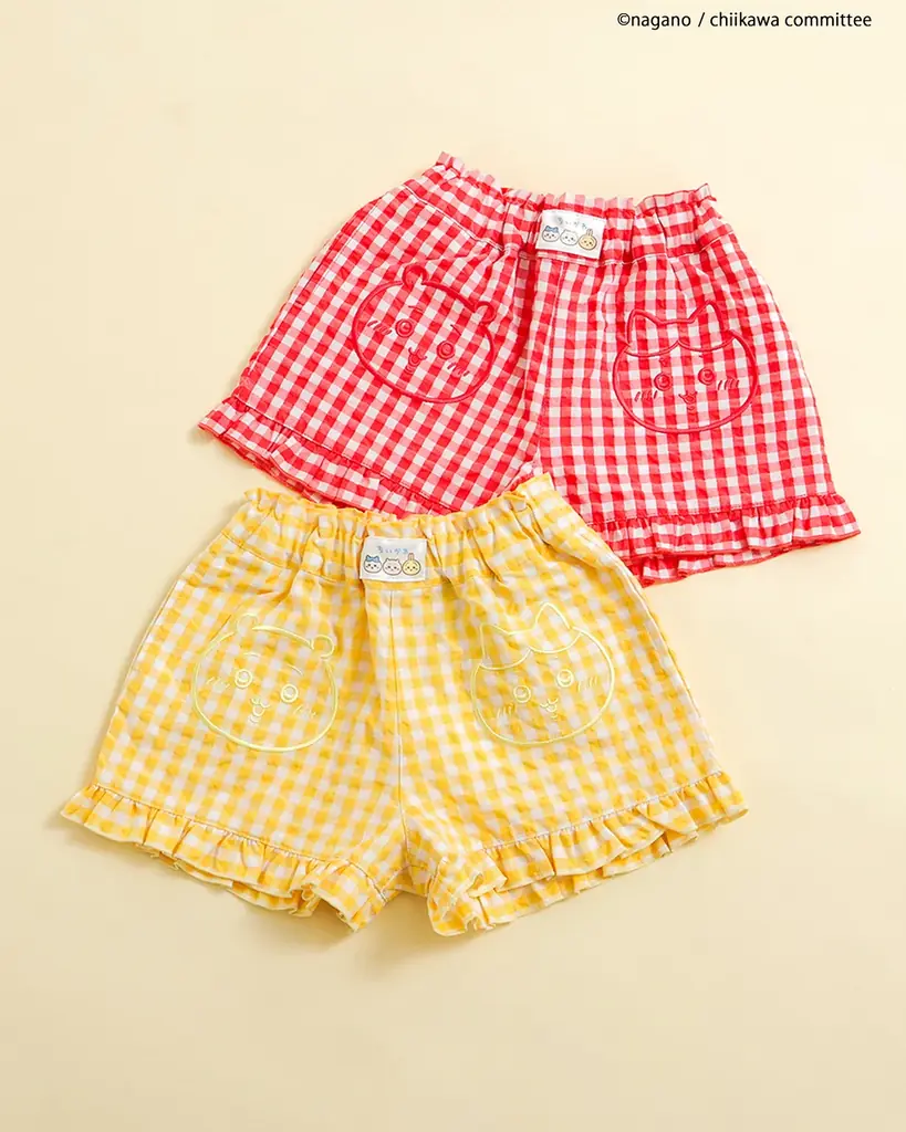アニメちいかわギンガムショートパンツは、夏らしいギンガムチェックと大きなちいかわデザインがポイントのショートパンツです。鮮やかなレッドとイエローの2色展開で、幅広いサイズを用意しています。