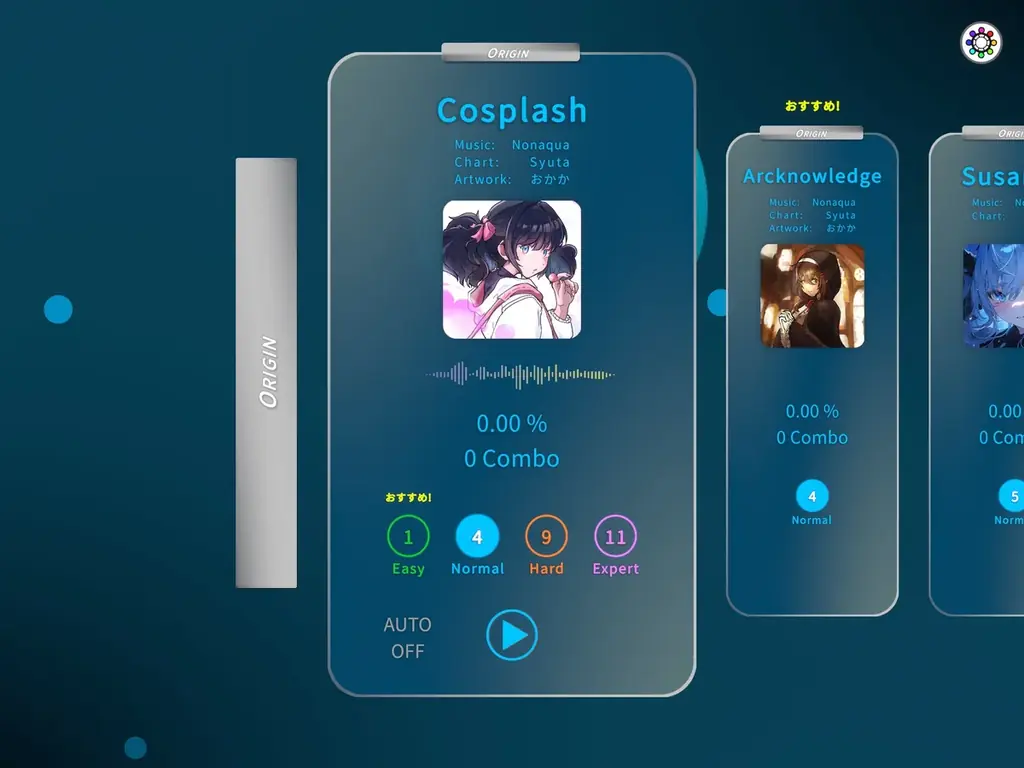 - 難易度レンジ: 片手操作向けの譜面から上級者向けの譜面まで。