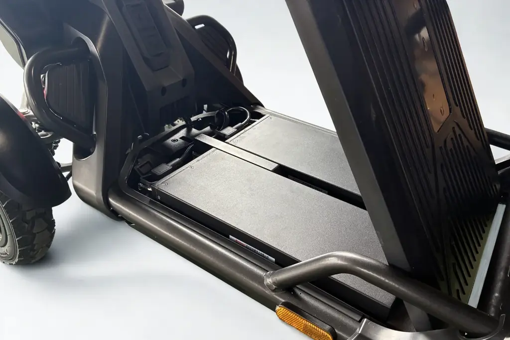 標準装備のバッテリー1個で約50kmの走行が可能な本機に、専用の追加バッテリーを加えることで、最大約100kmの航続距離が実現します。市内での一日移動や業務利用においてバッテリー残量を気にする場面を軽減し、行動範囲と利便性を向上させます。
