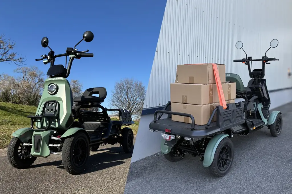 『BLAZE e-CARGO(ブレイズ イーカーゴ)』は、16歳以上であれば免許不要の車両区分「特定小型原動機付自転車」に対応する4輪電動バイクです。“小さな軽トラ”のような実用性を目指して設計され、荷台の積載性と高い安定性を両立しています。