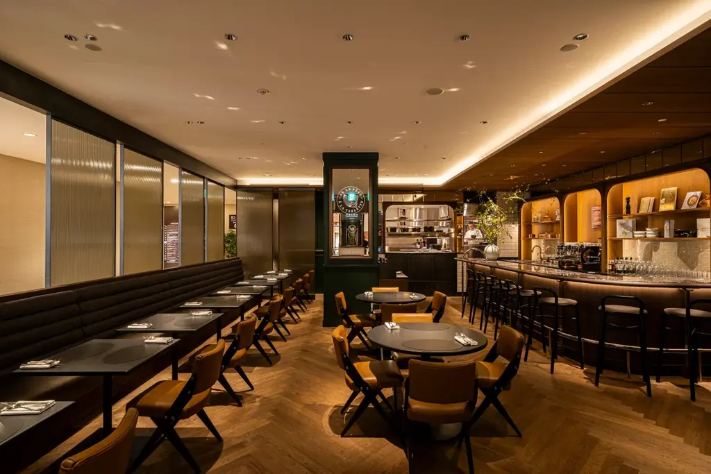 店内はアラン・デュカスの哲学に則り、クラシックとモダンを融合させた設計がなされています。内装には天然木、天然石、スチールの質感を組み合わせ、ダークグリーンとゴールドのアクセントを効かせることで、洗練された一方で親しみやすさも感じられる空間が創出されています。