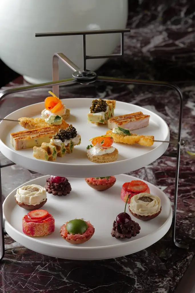 クロックムッシュ、キャビアをのせたワッフルなどのセイボリーと、春のフルーツを使った一口サイズのスイーツを組み合わせたセット。