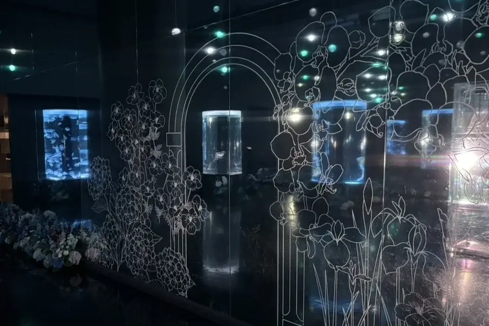 円柱型の水槽周辺には、クラゲの生態や特徴と親和性のある初夏の花々(アーティフィシャルフラワー)を配置しました。これらの花は鏡面や天井に幾重にも反射し、「花の空間がどこまでも続く」感覚を演出します。