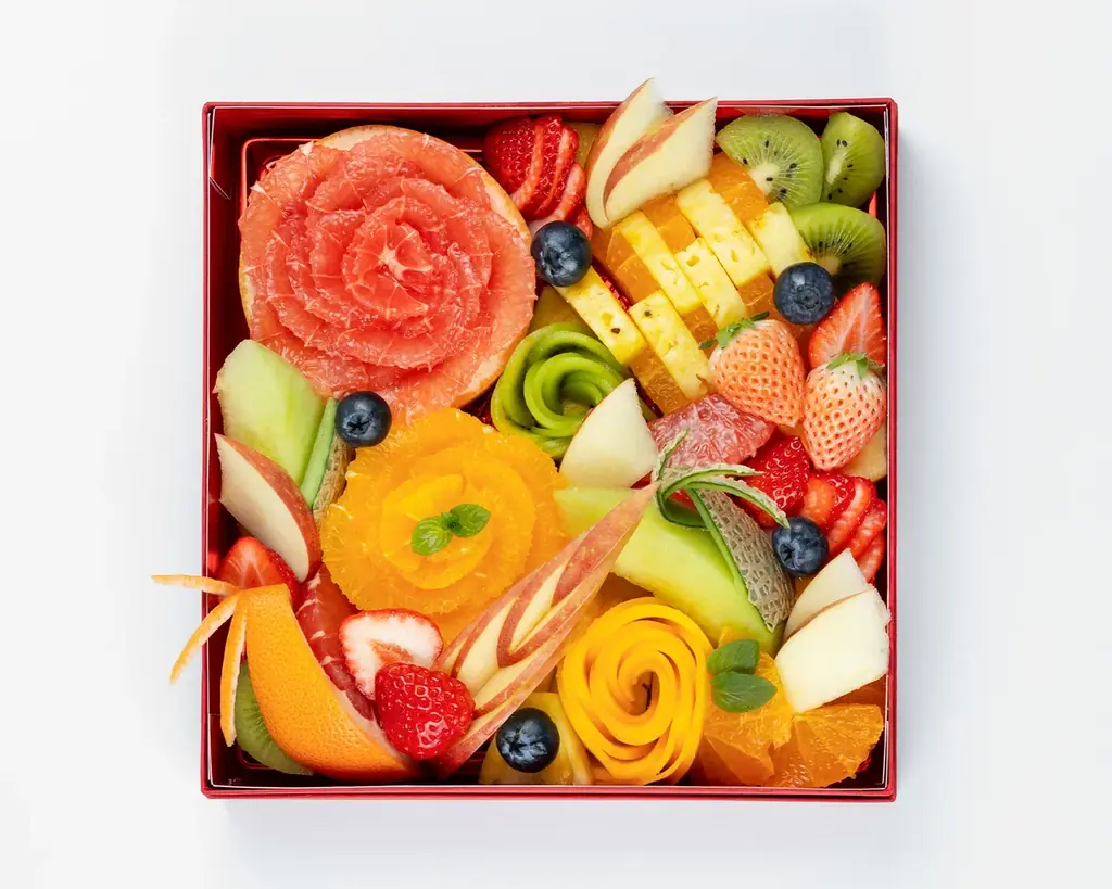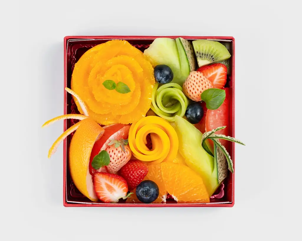 『フルーツボックス』は、果実そのものの美味しさをストレートに味わえることを目的としたカットフルーツの盛り合わせです。マンゴーやオレンジを花のように飾り切りし、りんごやメロンは見た目のアクセントになるようにカットして配置。ひとつひとつ熟練のスタッフが手作業で仕上げます。