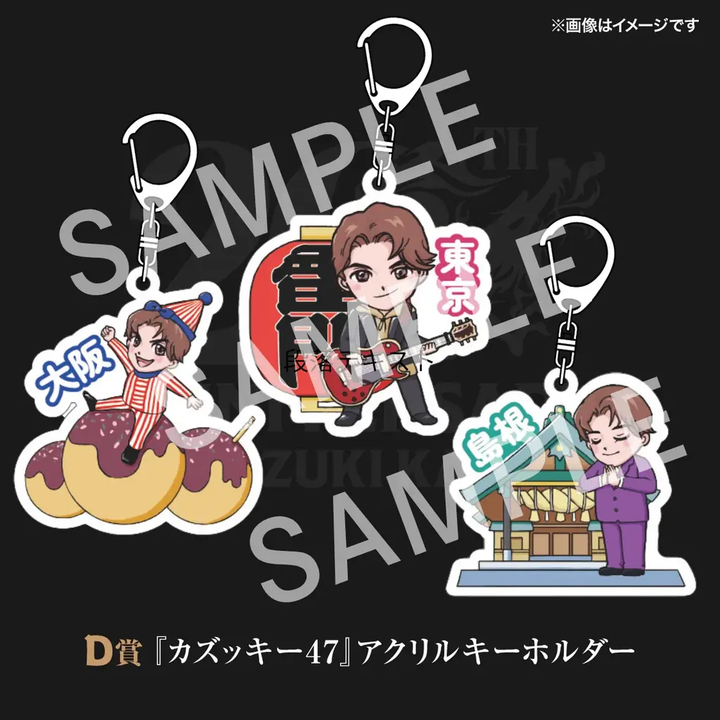 - D賞:『カズッキー47』アクリルキーホルダー ― 加藤和樹がキャラクターとして47都道府県の名所・名物とコラボした『カズッキー47』のアクリルキーホルダーです。『カズッキー47』の一覧画像は以下のリンクで確認できます: