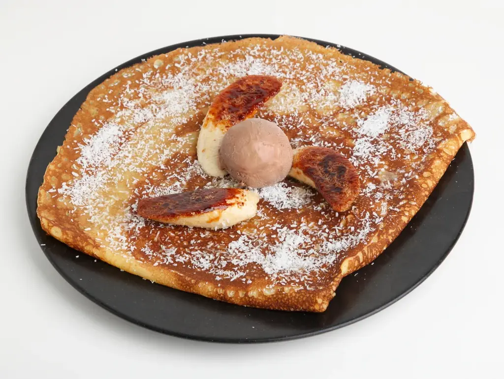 「ココバナーヌ」を提供。甘熟王バナナを香ばしくキャラメリゼし、ココナッツパッションフルーツのソース、ローストココナッツファイン、チョコレートアイスを合わせたクレープです。