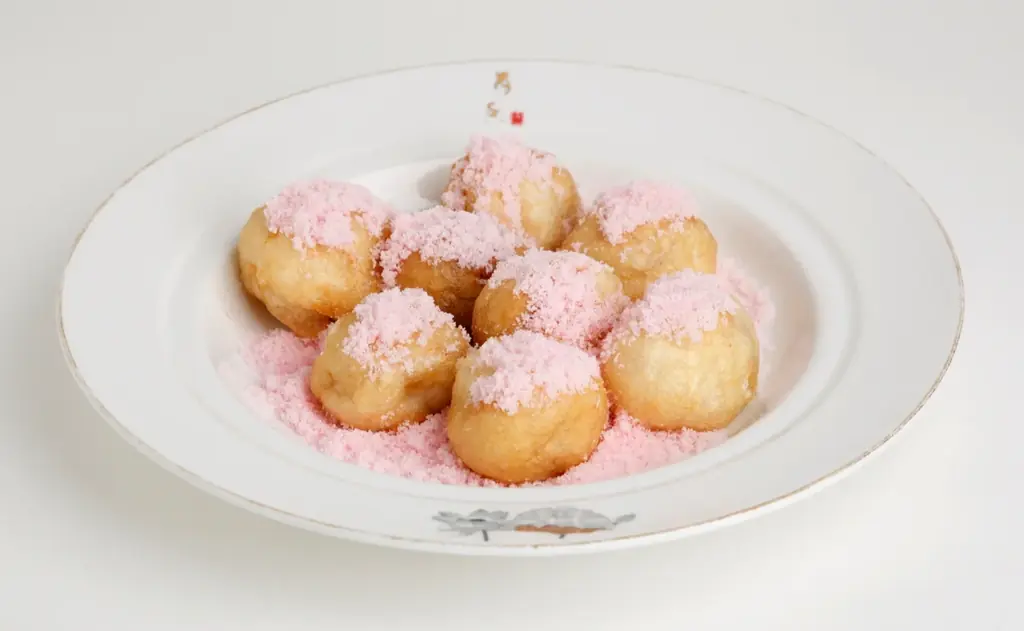 「揚げバナナ」を提供。甘熟王バナナに蓮の実を使った蓮餡を詰め、メレンゲの衣でふわっと一口サイズに揚げたデザート。ピンクの砂糖をまぶし見た目にも楽しめます。