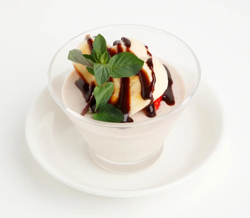 「チョコバナナ杏仁豆腐」を提供。甘熟王バナナの自然な甘みと香りを生かした杏仁豆腐にスライスバナナをのせ、濃厚なチョコレートソースで仕上げたデザートです。