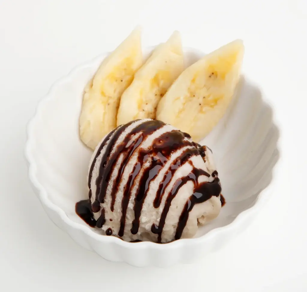 「甘熟王バナナアイス」を提供。甘熟王バナナを練り込んだバニラアイスにチョコレートソースをトッピングし、スライスバナナを添えています。
