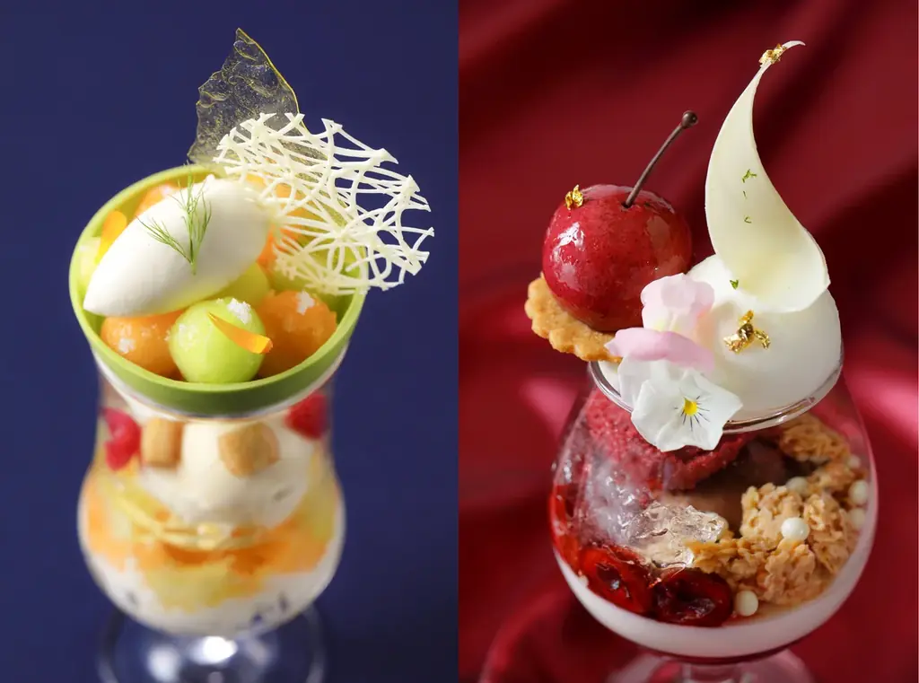両パフェは、それぞれの果実の個性と、それを引き立てるムースやジュレ、アイス、クランチなど多様な素材で層を作る点が共通している。パティシエは素材の香りや甘み、酸味のバランスを調整し、グラス内で視覚的にも楽しめるよう配慮している。